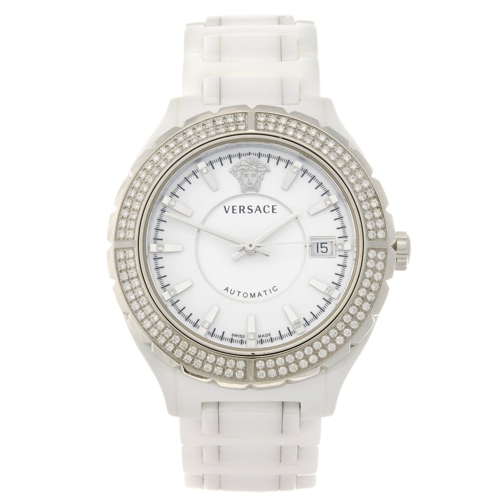 SoldVersace Diamond Stainless Steel Watch C5Q99METAL: Stainless Steel. MEASUREMENTS: Case 28 x 20mm, bracelet will fit approx. 6.75" wrist, with dual hidden deployant buckle. Black Versace dial with diamond bezel. MOVEMENT: Quartz, working orSee Sold Price