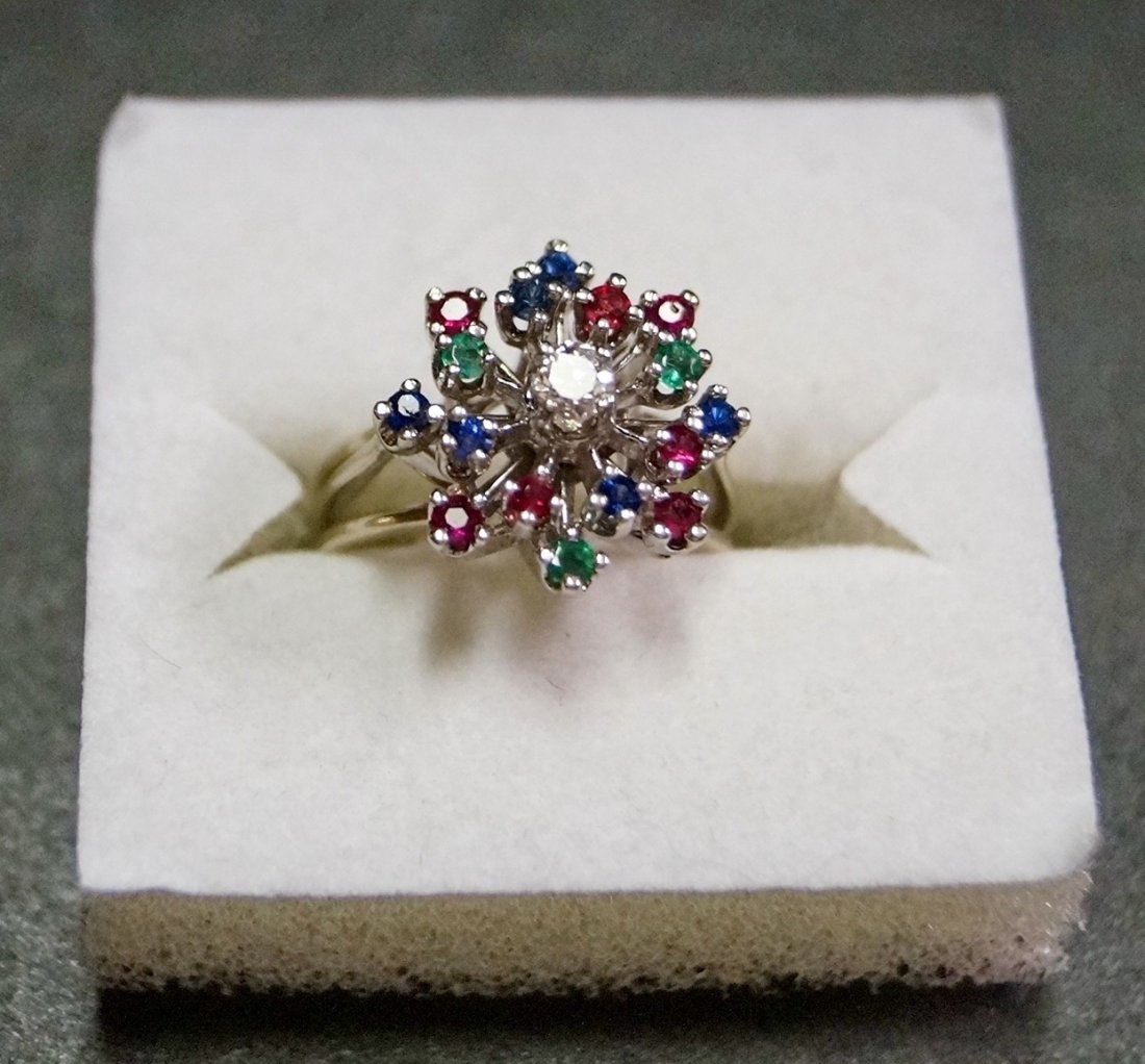 14 KT WHITE GOLD RUBY & SAPPHIRE DIAMOND RING