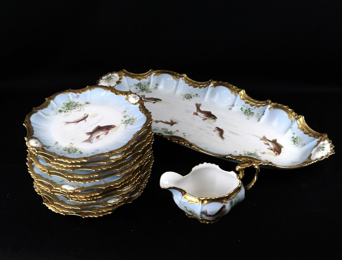 Sold15 Piece Limoges Porcelain Fish SetHand painted Limoges porcelain fish set, consisting of a platter, 12 plates and a sauce boat and underplate. Platter, sauce boat and underplate all T&V (Tressemanes & Vogt), plates Haviland. Plates 8See Sold Price