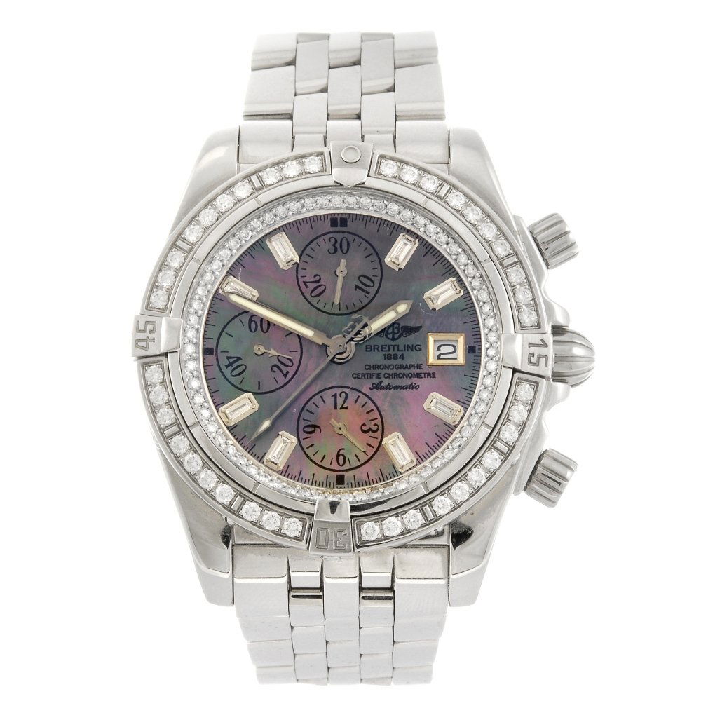 SoldBreitling Chronomat Evolution with DiamondsBreitling (Swiss, founded 1884). A men's stainless steel and diamond Chronomat Evolution watch with diamond bezel, sapphire crystal, mother-of-pearl dial with diamond hour markers, luminous hands, datSee Sold Price