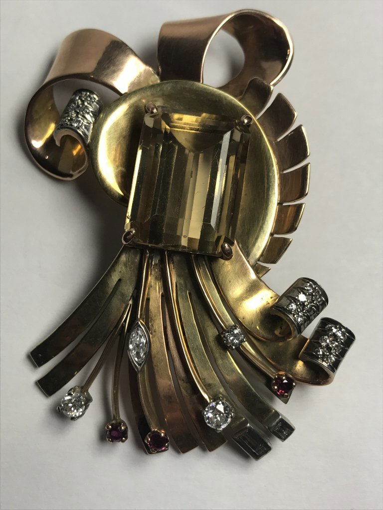 14k citrine brooch, ruby diamond, 24.8 dwts