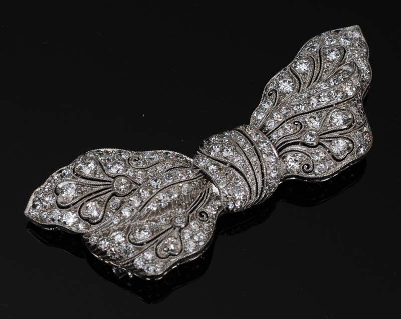 Sold14K White Gold Diamond "ribbon" Brooch, 19.3 Grams C. 1920, L 2.2''14K White Gold Diamond "ribbon" Brooch, 19.3 Grams C. 1920, L 2.2'' Diamond melee throughout. Carefully made.See Sold Price