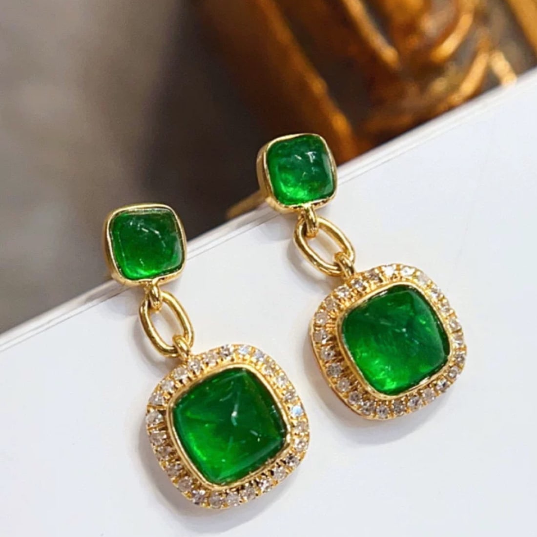 Sold14k Gold 3 Ct Vivid Green Natural Emerald & Diamond EarringsRef:231036201 // gold content:14k gold // main gemstone:emerald // shape:suger-loaf // carat weight:3ct // color:vivid green // treatment:natural // // adjacent gemstone 2 : diamond // shape:round //See Sold Price