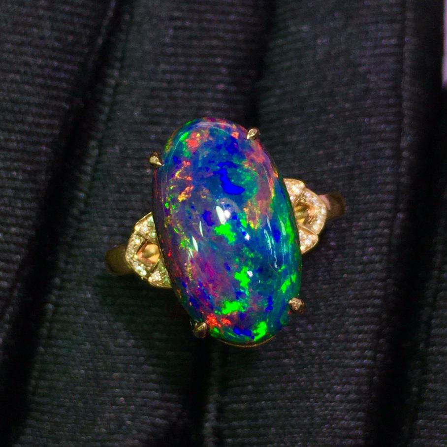 Sold14K GOLD 3.95 CT NATURAL OPAL & DIAMOND RINGRef:230618402 Gold Content:14K Gold Ring Size:7.25US Main Gemstone:Opal Number of stones:1 Shape:Oval Carat Weight:3.95ct Color:Black Treatment:Natural Cut Grade:G Adjacent Gemstone 2 : DiamonSee Sold Price