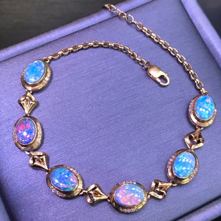 Sold14K GOLD 6.82 CT NATURAL OPAL & DIAMOND BRACELETRef:230676199 Gold Content:14K Gold Main Gemstone:Opal Number of stones:6 Shape:Oval Carat Weight:6.82ct Color:Color Treatment:Natural Cut Grade:G Adjacent Gemstone 2 : Diamond Shape:RoundSee Sold Price