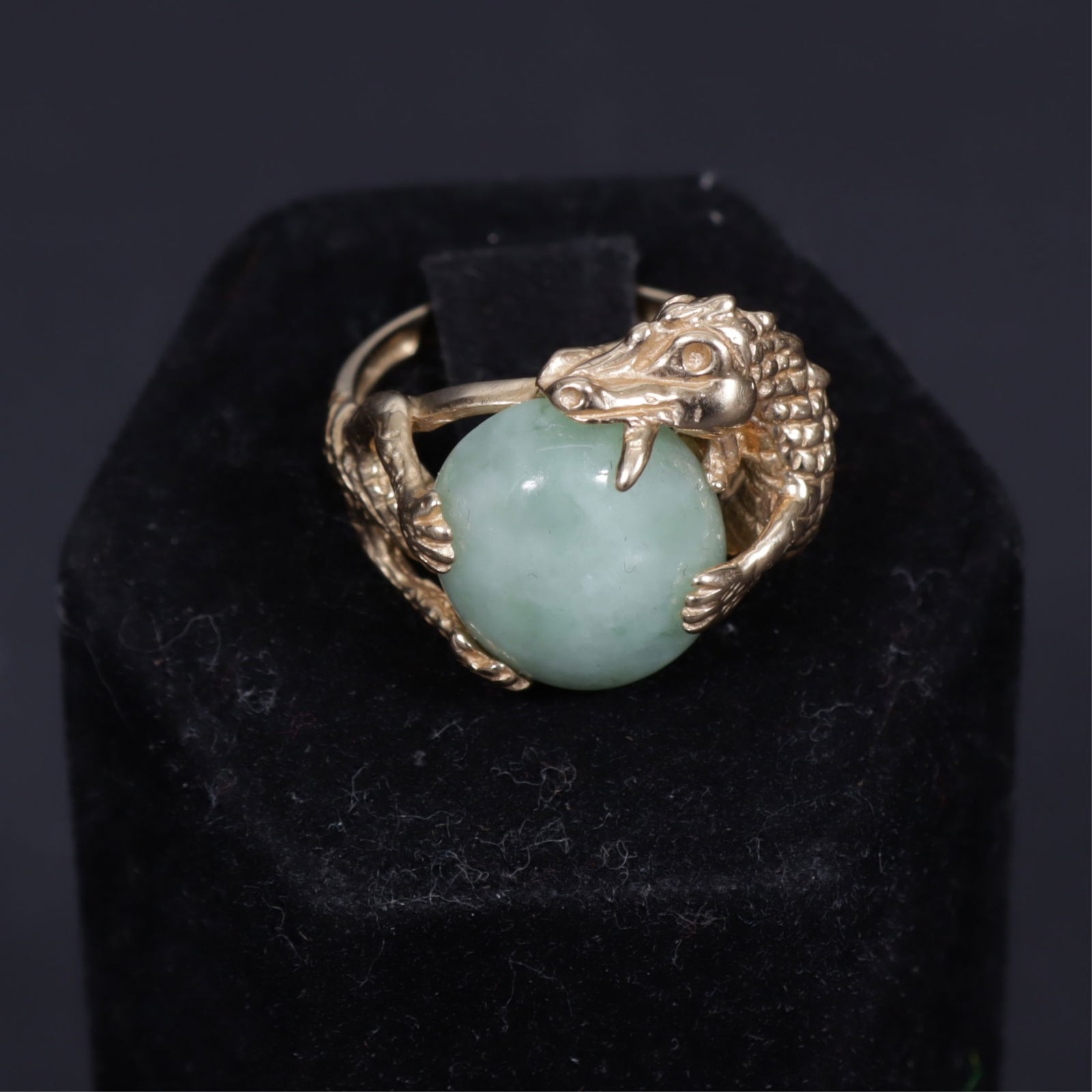 14k Gold Natural Icy Green Jade Cabochon Ring
