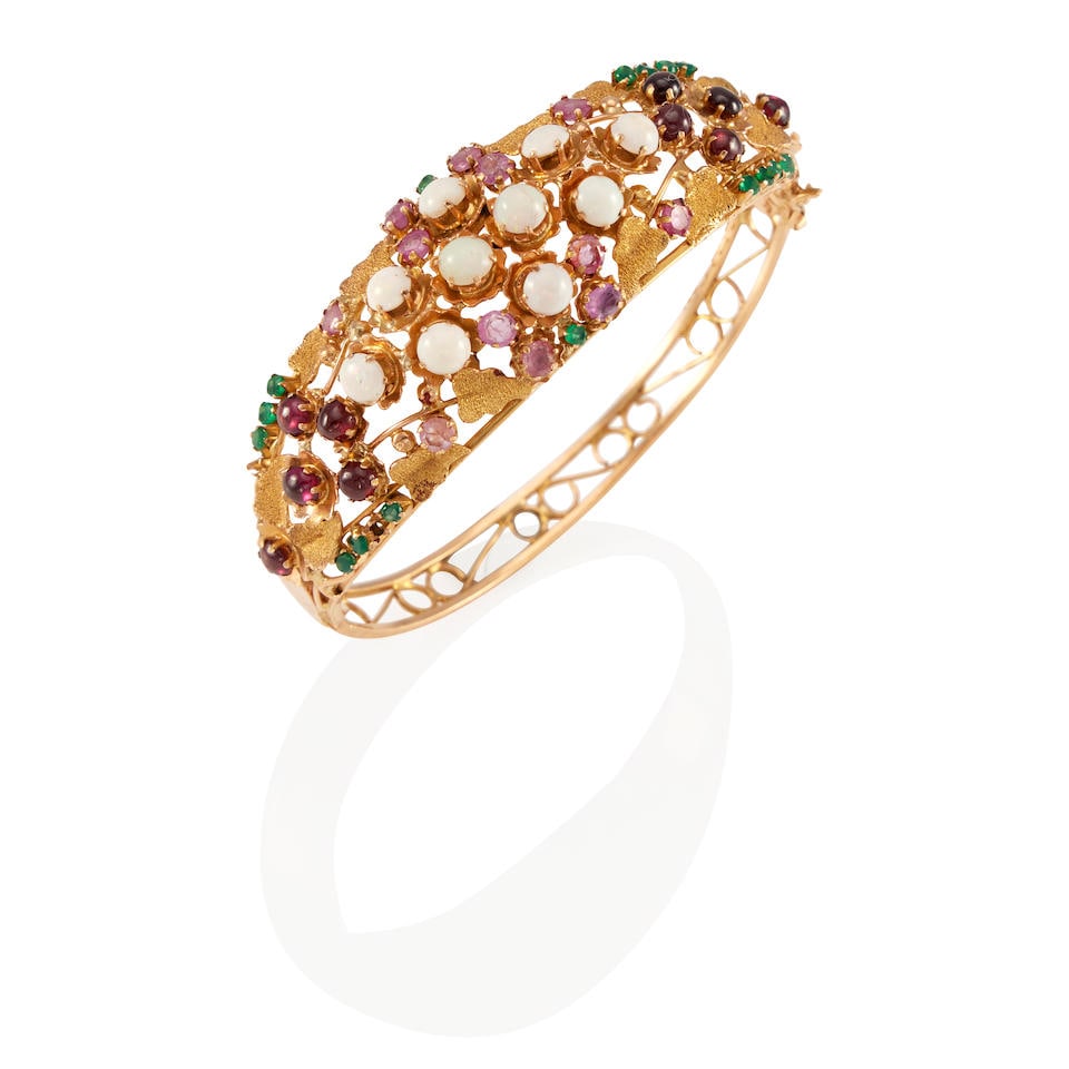 14K GOLD AND GEM-SET BANGLE BRACELET