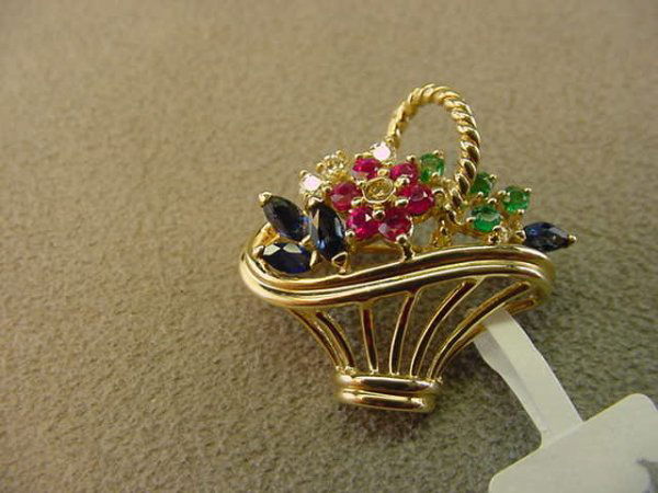 14K GOLD BLUE SAPH,RUBY,EMERALD FLOWER BASKET PIN