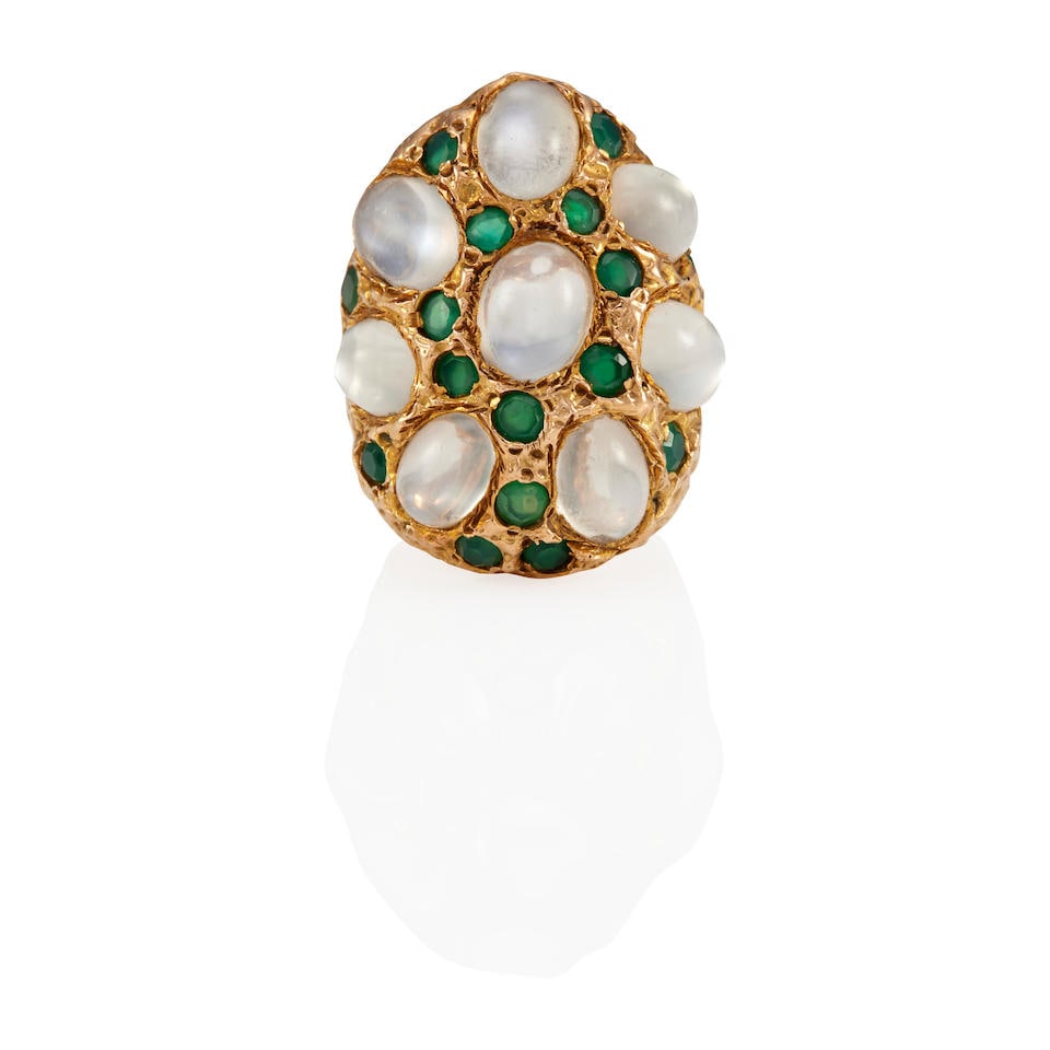 14K GOLD, EMERALD, MOONSTONE AND DIAMOND RING