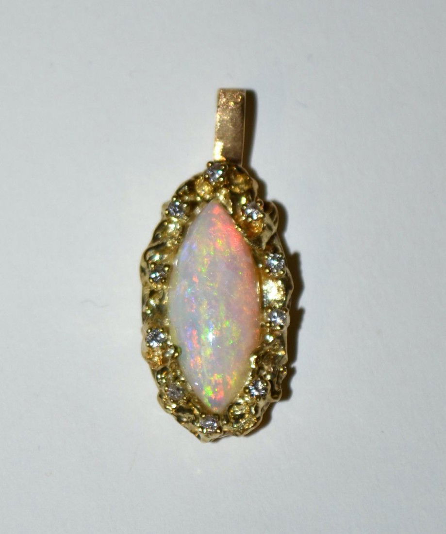 SoldSilver Topped 14k Gold Opal PendantSilver Topped 14k Gold Opal Pendant Silver Topped 14k Gold Opal Pendant Containing one opal cabochon approximately 21.56 x 12.79 x 5.24 mm, with sixteen full cut diamonds weighing approximately 0.60 cSee Sold Price