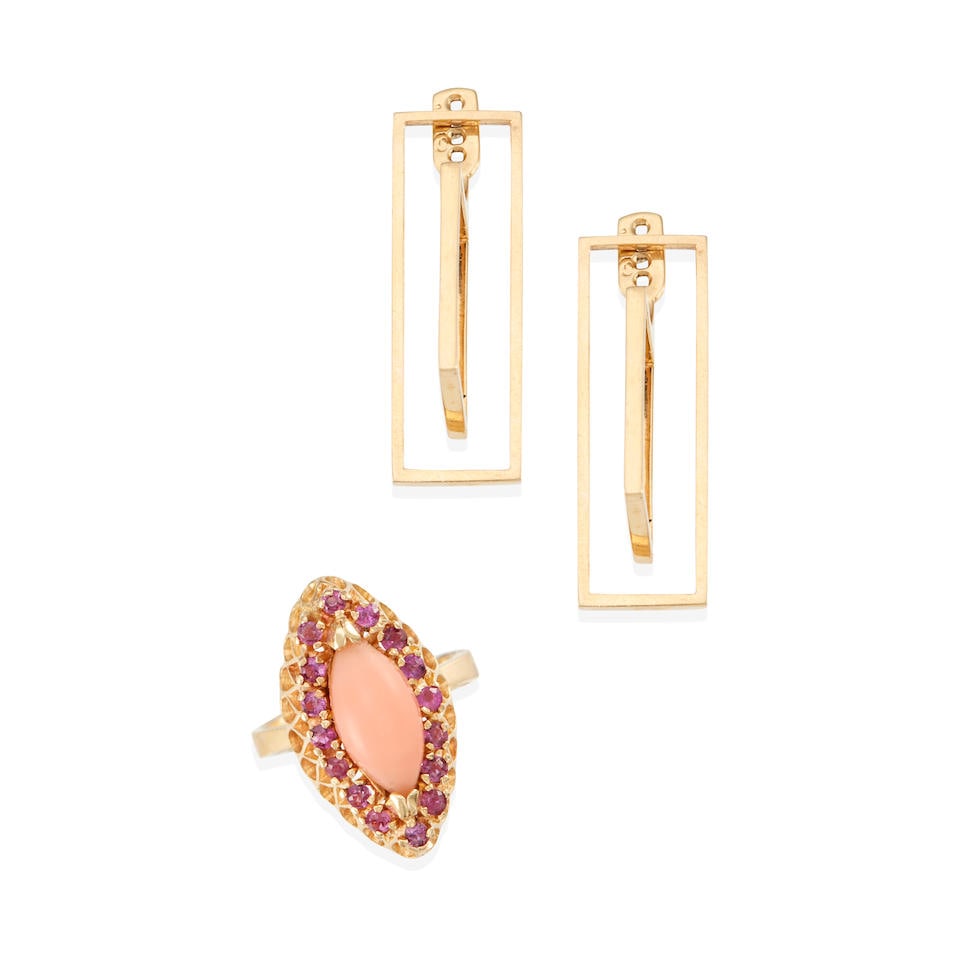 14K GOLD, RUBY AND CORAL EARRINGS AND RING