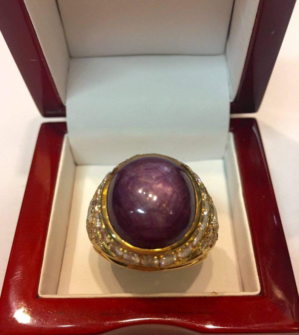 Sold14K Gold Star Ruby and Diamond Vintage RingSTAR RUBY RING approx.10 carats with diamonds ring, size approx. 7.5 and weighing approx. 5 dwt vintage and in good conditionSee Sold Price