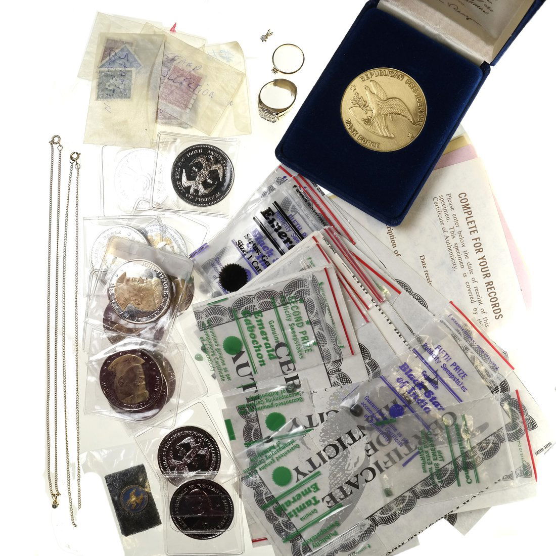 ANTIQUE MIXED JEWELLERY LOT BROOCHES, RINGS ETCLot of Vintage Medals, Pins, etc Includes World's Fair2 days LeftBig group lot of vintage 925 sterling silver mixed jewelryFeb 15, 2026Estate lot contemporary jewelry & a few vintage TIMEX watches, Swatch ladies, sterling tie clasp &23 hrs LeftLot of Costume Jewelry, Belt Buckle, Smalls, Etc4 days LeftCostume Jewelry Lot Pendants Earrings Rings and Mixed Accessories944 Lots AwayLot of Pins, Medals, Lighters, & More - WWI WWII2 days Left35 Pc. Lot: 14 Pairs Costume Fashion Jewelry Earrings, 2 Necklaces, 1 Bracelet, 4 PinsFeb 15, 2026Lot Of Gold Plated Coins3 days LeftLARGE LOT OF COSTUME JEWELRYFeb 22, 2026Lot of Vintage Jewelry Fobs, Tie Tacks, etc2 days LeftWWII Militaria Collection Order Medal Badge RibbonInsignia Pins etcFeb 22, 2026Buffalo Nickel Tie Tac, Zippo Lighter, Wayne Co. Comm. Coin, Azurite Pendant and MoreMar 02, 2026Sterling Jewelry Group with Rings, Necklaces, Earrings and Pins2 hrs LeftCollection of 14k, 10k, and Sterling Jewelry3 days LeftLARGE COLLECTION ISRAELI COINS & MEDALSFeb 22, 2026