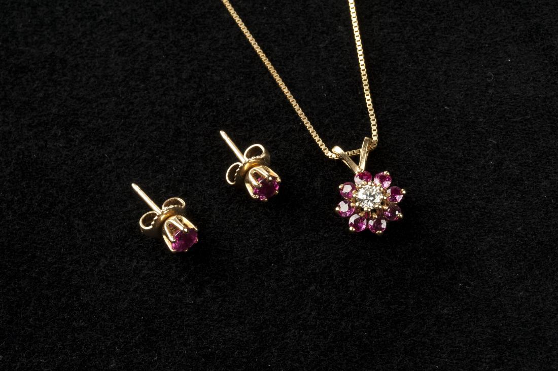 SoldA group of ruby and diamond jewelry14k yellow gold Including a cluster necklace set with rubies and diamond (15" L x 1" H), a pair of pin wheel earrings set with round diamonds and rubies, with clip backs a posts (.75" Dia), a pendantSee Sold Price