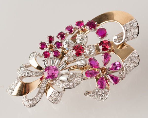 14K Two Tone, Ruby and Diamond Brooch, Retro (1935-