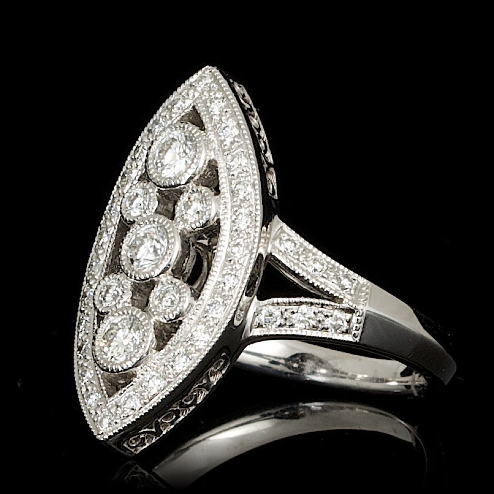 SoldLADIES 14K WHITE GOLD & DIAMOND RINGA swirl design criss-cross ring set with very fine full cut round diamonds totaling approx. 3 cts.See Sold Price
