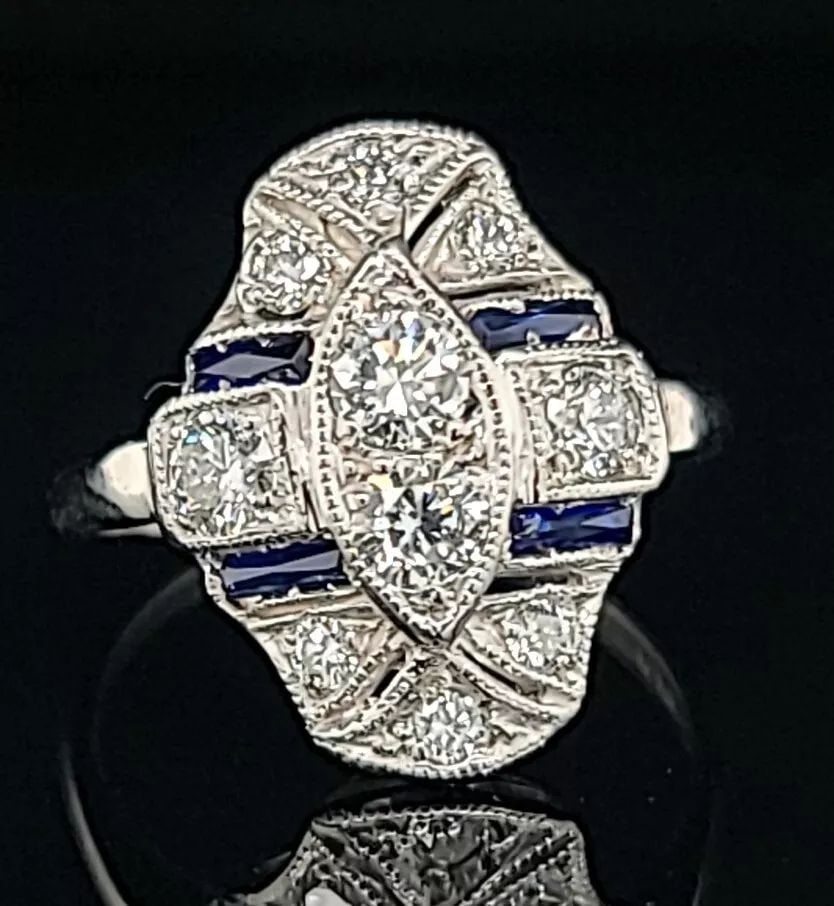 Vintage Estate 14k White Gold Sapphire and Diamond Art Deco RingVintage Estate 14k White Gold Sapphire and Diamond Art Deco Ring Vintage / Estate 14k White Gold Art Deco Ring with etchings, a center round Old Miner Diamond and 2 square natural blue Sapphires. OneSee Sold Price
