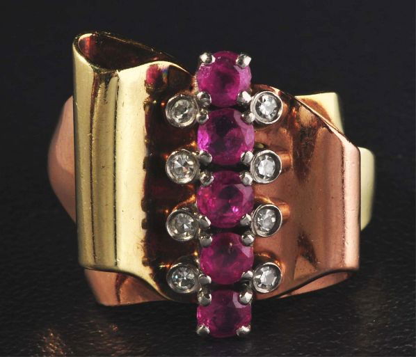 SoldArt Deco/Moderne 14K Gold Diamond Ruby RingRing, 14K rose gold, ruby and diamond ring, in the art deco or art moderne style, 7.8 grams.See Sold Price