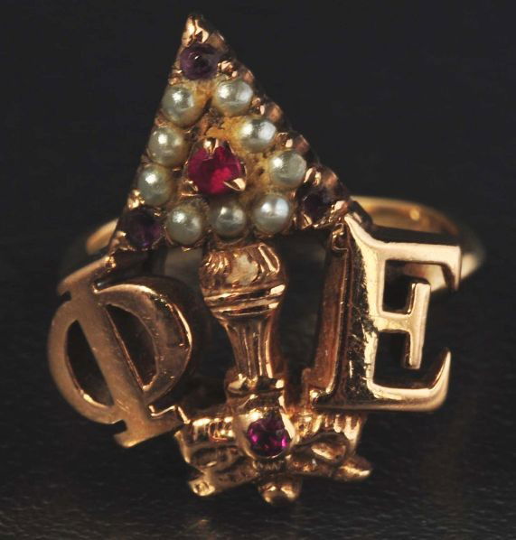 14K Y. Gold Seed Pearl & Ruby Fraternity Ring.
