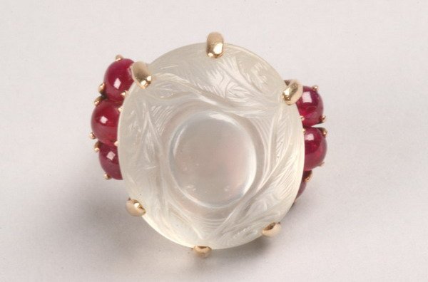 14K YELLOW GOLD, MOONSTONE AND RUBY RING.