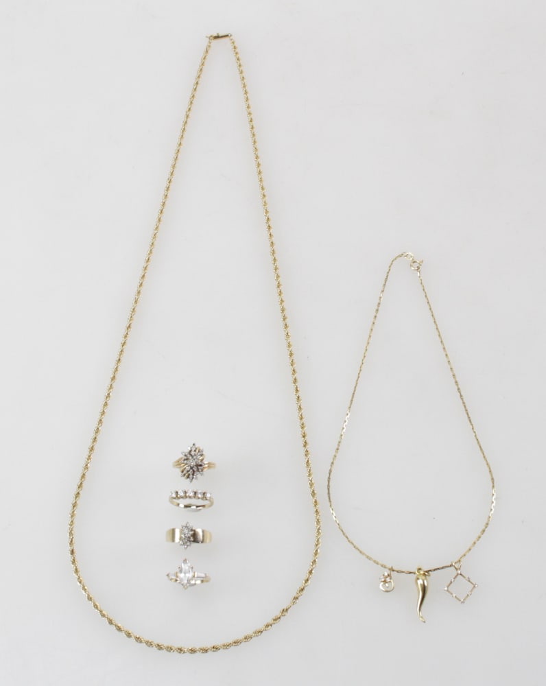 14K Yellow Gold Jewelry Lot. Earrings, Ring, Bracelet, Pendant and Necklace. Wt. 53.7 grams.5 days Left14K Yellow Gold Pearl Lot. 3 necklace with 14K gold clasp, 2 Bracelets with 14k gold clasp, 2 rings5 days Left14k Yellow Gold Necklaces and Rings2 days LeftGold Vendome Necklace Diamond 0.14Ct Station 18K 750 Yellow7 days LeftGold Pola Necklace Diamond 0.15Ct Layered 18K 750 Yellow2 days LeftGold Star Jewelry Necklace Diamond 0.06Ct Solitaire Ydrop 18K 750 YellowMar 15, 2026Gold Vendome Necklace Diamond 0.06Ct Solitaire 18K 750 YellowMar 14, 2026NEW 14K YELLOW GOLD FANCY SET BRACELET RING NECKLACE EARRINGS7 days Left14K Gold Link Chain L 31" 14 g 1 PCMar 19, 2026A Suite of Assorted 14 Karat Yellow Gold JewelryMar 22, 2026Gold Vendome Necklace Diamond 18K 750 YellowMar 05, 2026K18YG HEART DIAMOND NECKLACEMar 20, 202614K WHITE GOLD AND DIAMOND PENDANT NECKLACE AND RINGGold Diamond 0.04Ct/ 0.04Ct Cross Earrings 18K 750 Yellow7 days LeftNEW 14K YELLOW GOLD FANCY SET PENDANT AND EARRINGS7 days LeftNEW 14K YELLOW GOLD FANCY DIAMON DROP CZ SET EARRINGS PENDANTMar 17, 2026