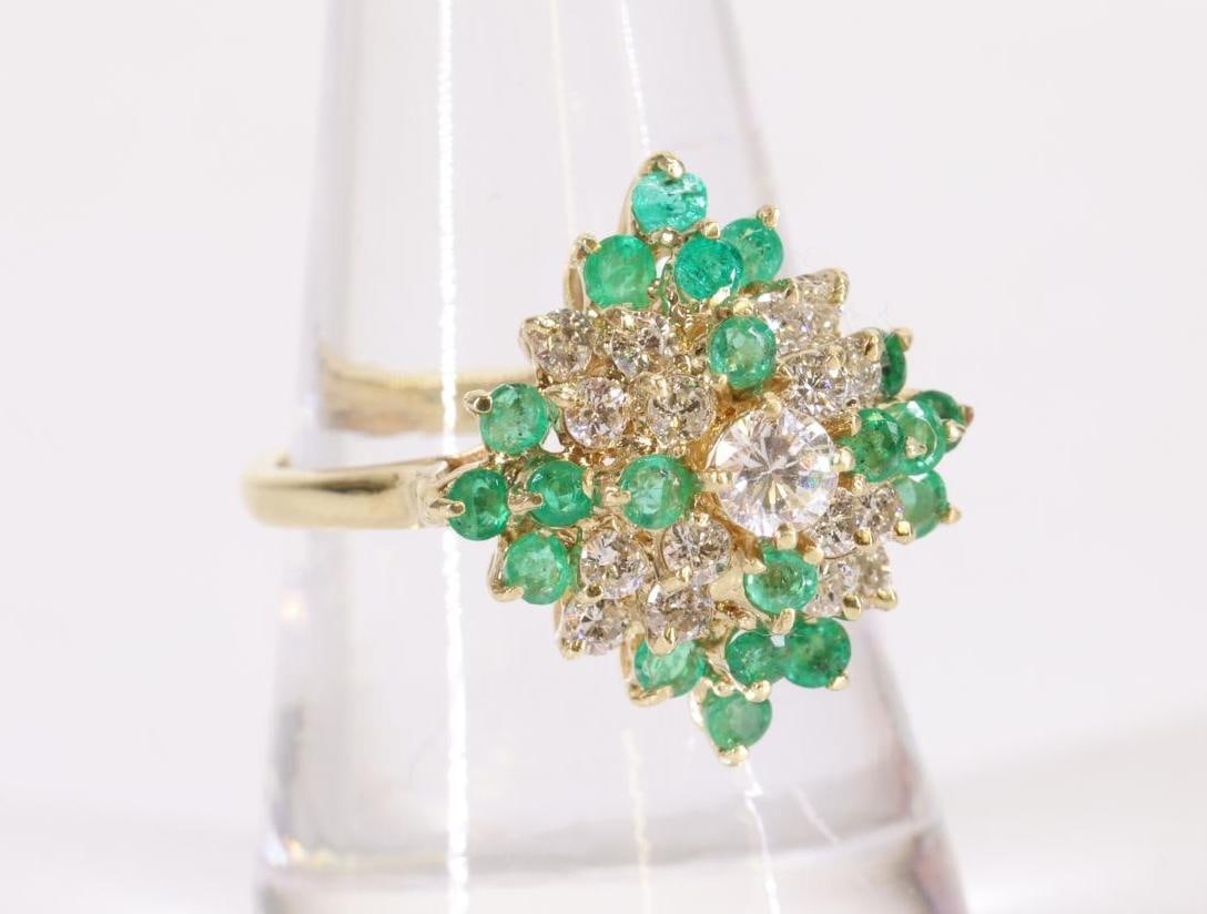 Sold14k YG Diamond Emerald Ring14k yellow gold ring set with approx. 1.2 carats of round cut diamonds and 1.5 carats of round cut emeralds in a multi-tiered cluster setting. Size 7.25, 4.6 dwt.See Sold Price