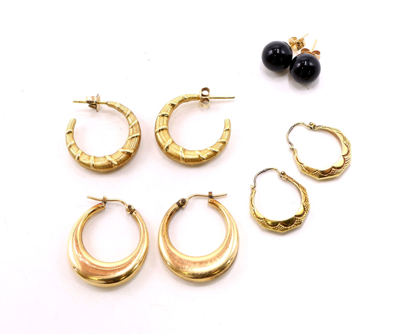 Sold14k YG Earrings(3) sets of 14k yellow gold hoop earrings and one 14k yellow gold black glass bead pair. Largest pair 1". 4.2dwt not including glass pair.See Sold Price
