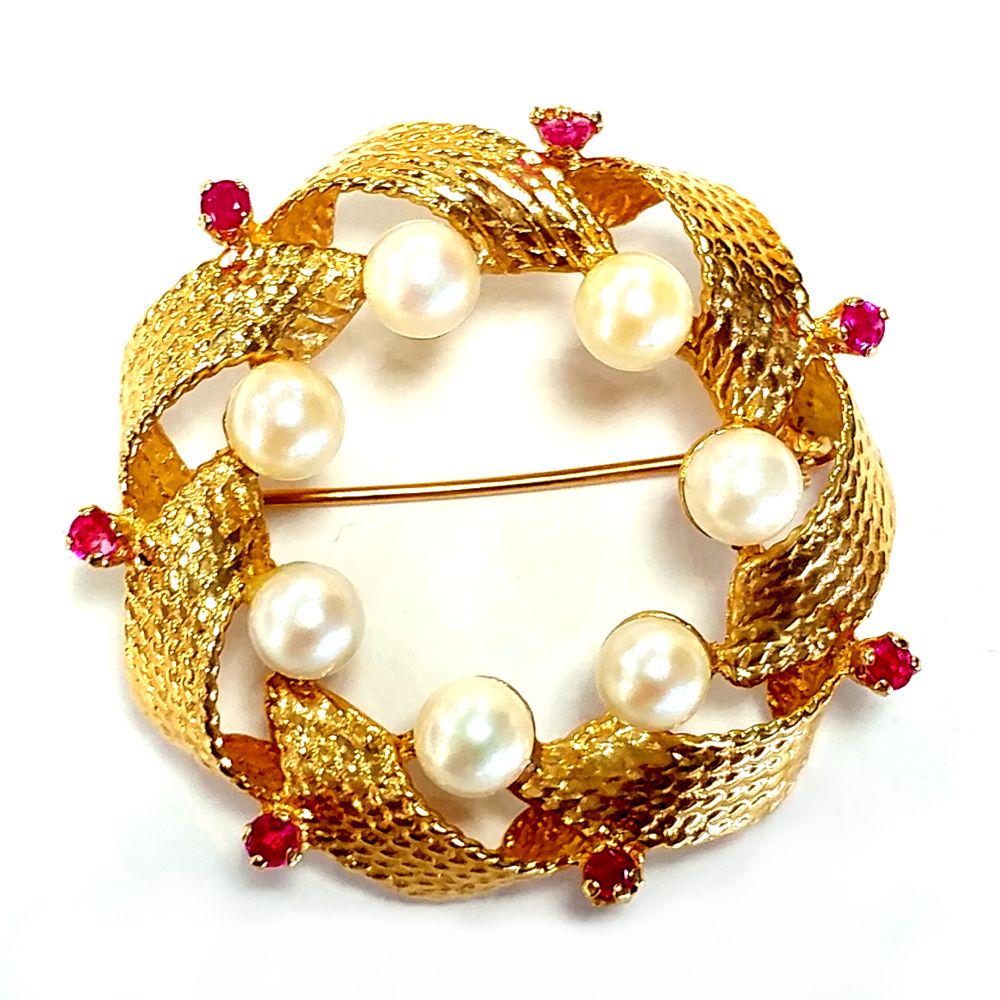 18K YELLOW GOLD FLORAL BROOCH / PIN SET WITH 7.5MM PEARL AND 0.15CTS OF RUBIESModern Jewelry4.4(205)$1,27517 hrs Left