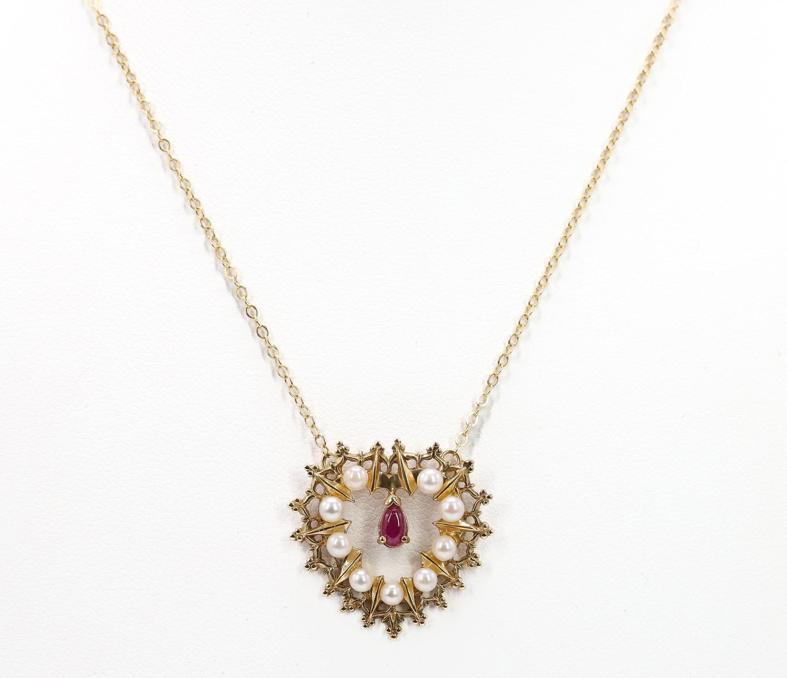 SoldVintage 14k Rolled Gold Ruby & Pearl NecklaceThis necklace is 14” long and weighs 1.5 grams. Pendant has a .88” drop and is .43” wide. The pearls are 3.5mm and the rubies are 2mm rounds. What is also neat it that the chain and pendant areSee Sold Price