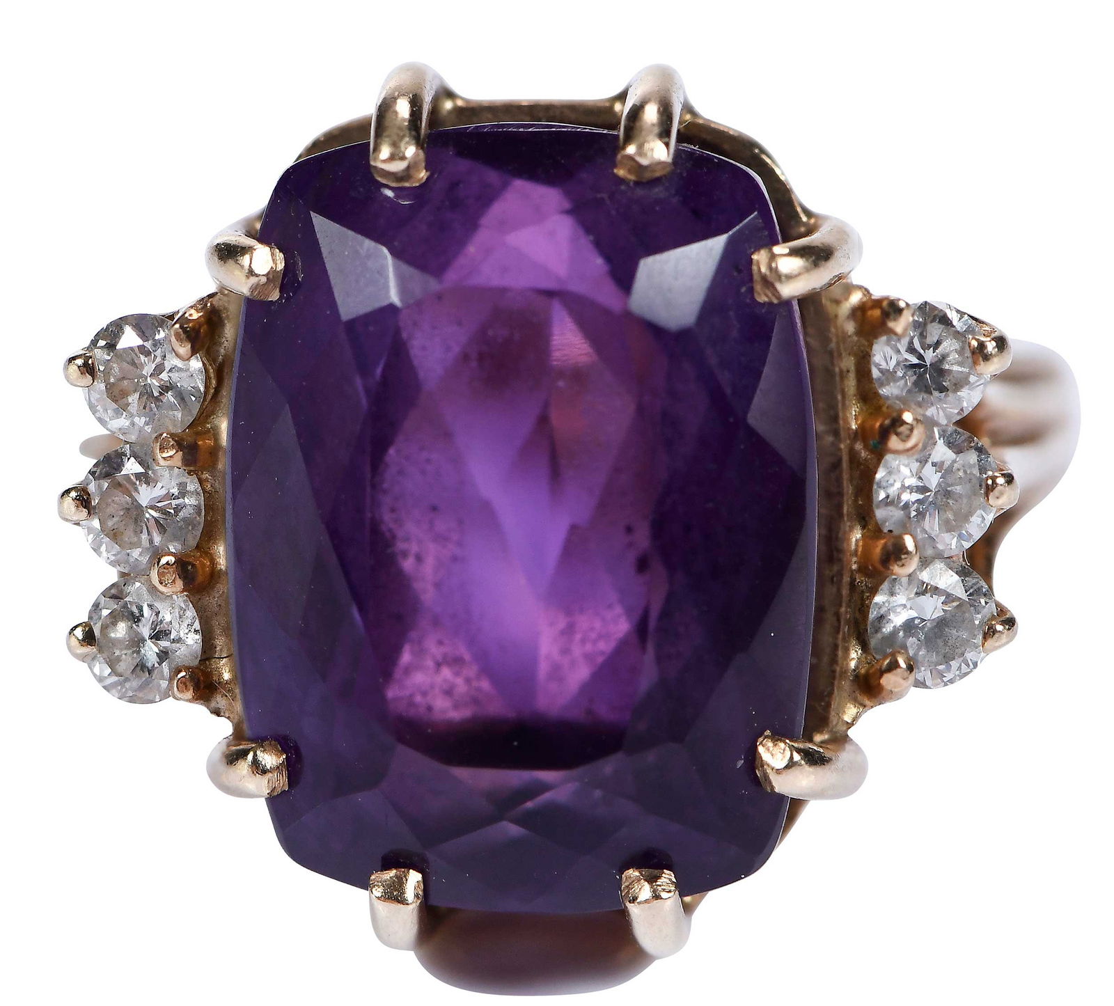 SoldJEWELRY. 14kt Gold Amethyst and Diamond Ring.14kt yellow gold cocktail ring displaying a central prong-set emerald faceted Amethyst flanked by trefoils of prong-set round faceted diamonds. Amethyst measures approx. 17.5mm x 12.5mm x 8.15mm; diamSee Sold Price