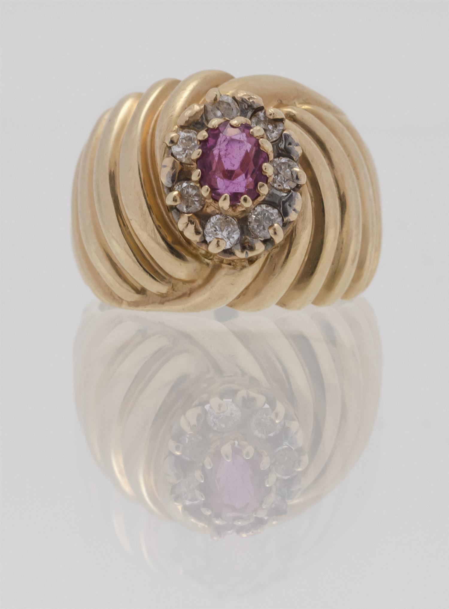 14kt Gold, Ruby And Diamond Ring Wide Ribbed Shank