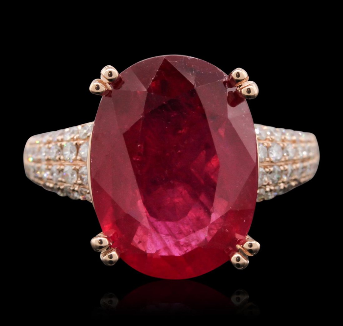 Sold14K Rose Gold Ruby Diamond Ring, 6.5ctItem: 14K Rose Gold Ruby Diamond Ring Markings: 14K hallmarked Metal: Rose gold, 3.40 grams Ring Size: 18 Main Stone: Ruby Ruby Weight: 6.50 ct Color: Purple red Clarity: Transparent with inclusions TSee Sold Price