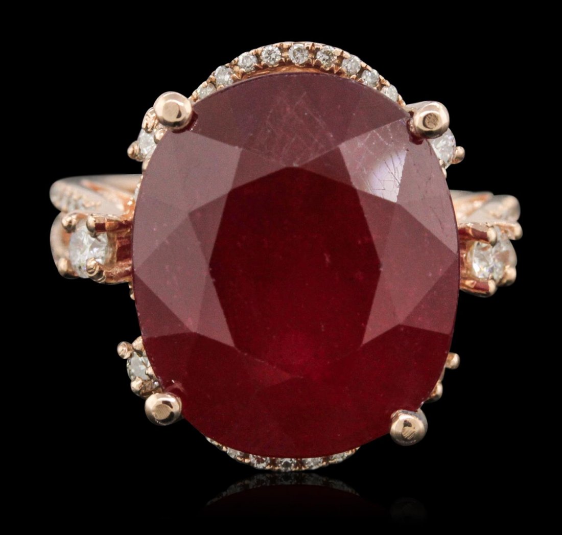 Sold14K Rose Gold Ruby Diamond Ring, 6.5ctItem: 14K Rose Gold Ruby Diamond Ring Markings: 14K hallmarked Metal: Rose gold, 3.40 grams Ring Size: 18 Main Stone: Ruby Ruby Weight: 6.50 ct Color: Purple red Clarity: Transparent with inclusions TSee Sold Price