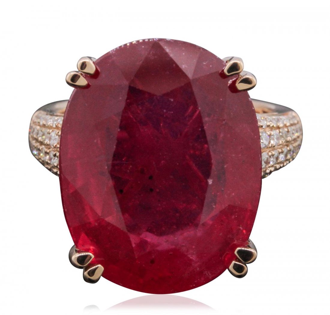 Sold14K Rose Gold Ruby Diamond Ring, 6.5ctItem: 14K Rose Gold Ruby Diamond Ring Markings: 14K hallmarked Metal: Rose gold, 3.40 grams Ring Size: 18 Main Stone: Ruby Ruby Weight: 6.50 ct Color: Purple red Clarity: Transparent with inclusions TSee Sold Price