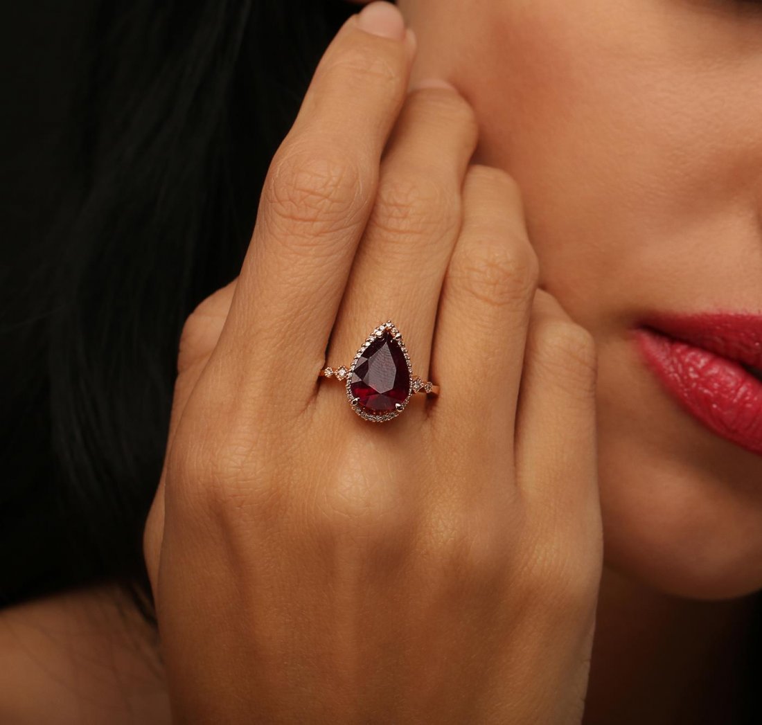 Sold14K Rose Gold Ruby Diamond Ring, 6.5ctItem: 14K Rose Gold Ruby Diamond Ring Markings: 14K hallmarked Metal: Rose gold, 3.40 grams Ring Size: 18 Main Stone: Ruby Ruby Weight: 6.50 ct Color: Purple red Clarity: Transparent with inclusions TSee Sold Price