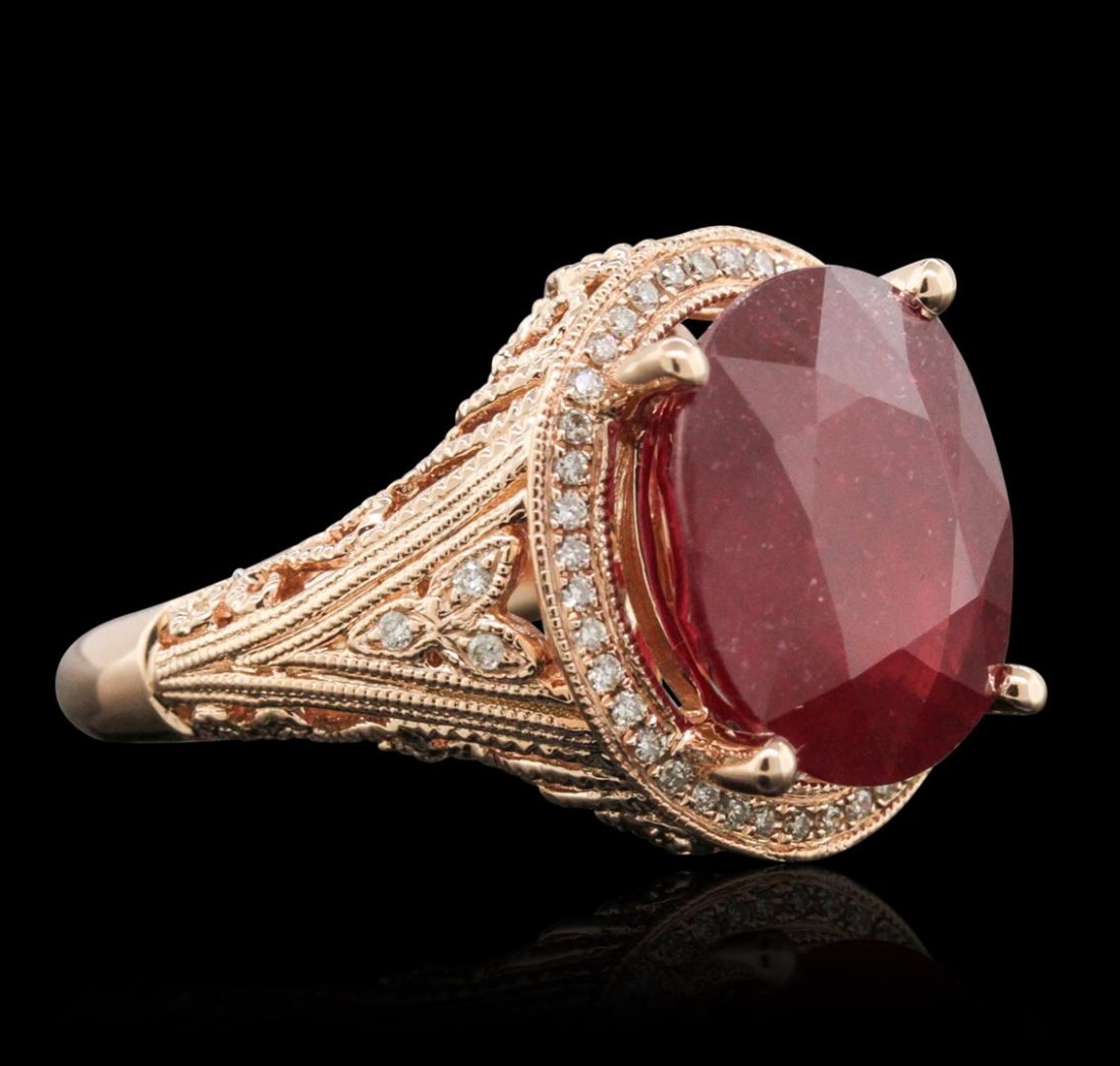 Sold14K Rose Gold Ruby Diamond Ring, 6.5ctItem: 14K Rose Gold Ruby Diamond Ring Markings: 14K hallmarked Metal: Rose gold, 3.40 grams Ring Size: 18 Main Stone: Ruby Ruby Weight: 6.50 ct Color: Purple red Clarity: Transparent with inclusions TSee Sold Price