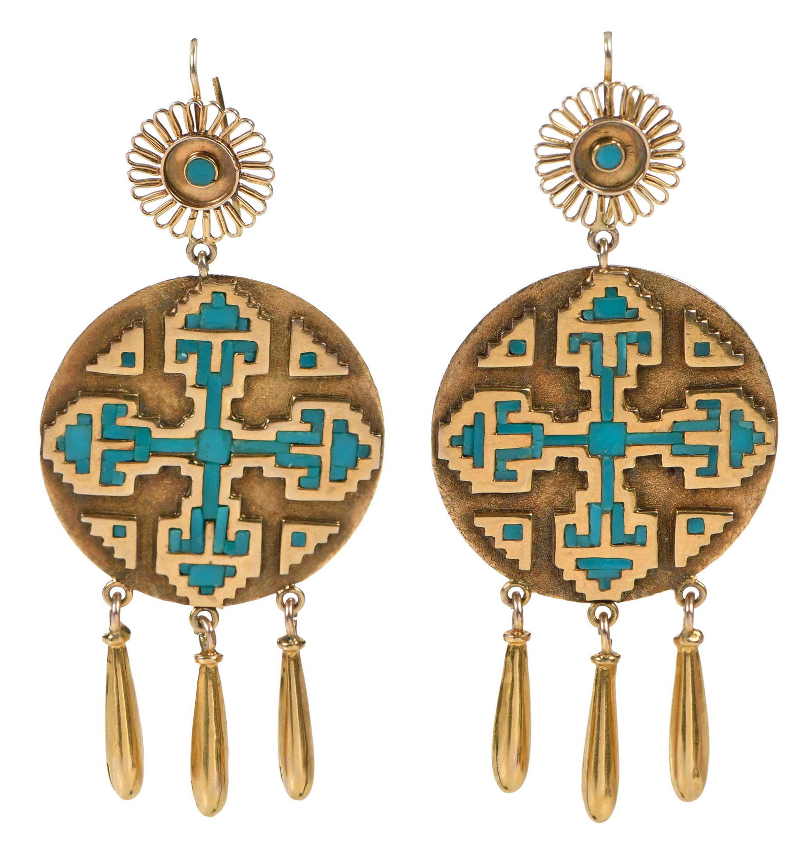 Pair of Turquoise, 18k, 14k Yellow Gold Earrings