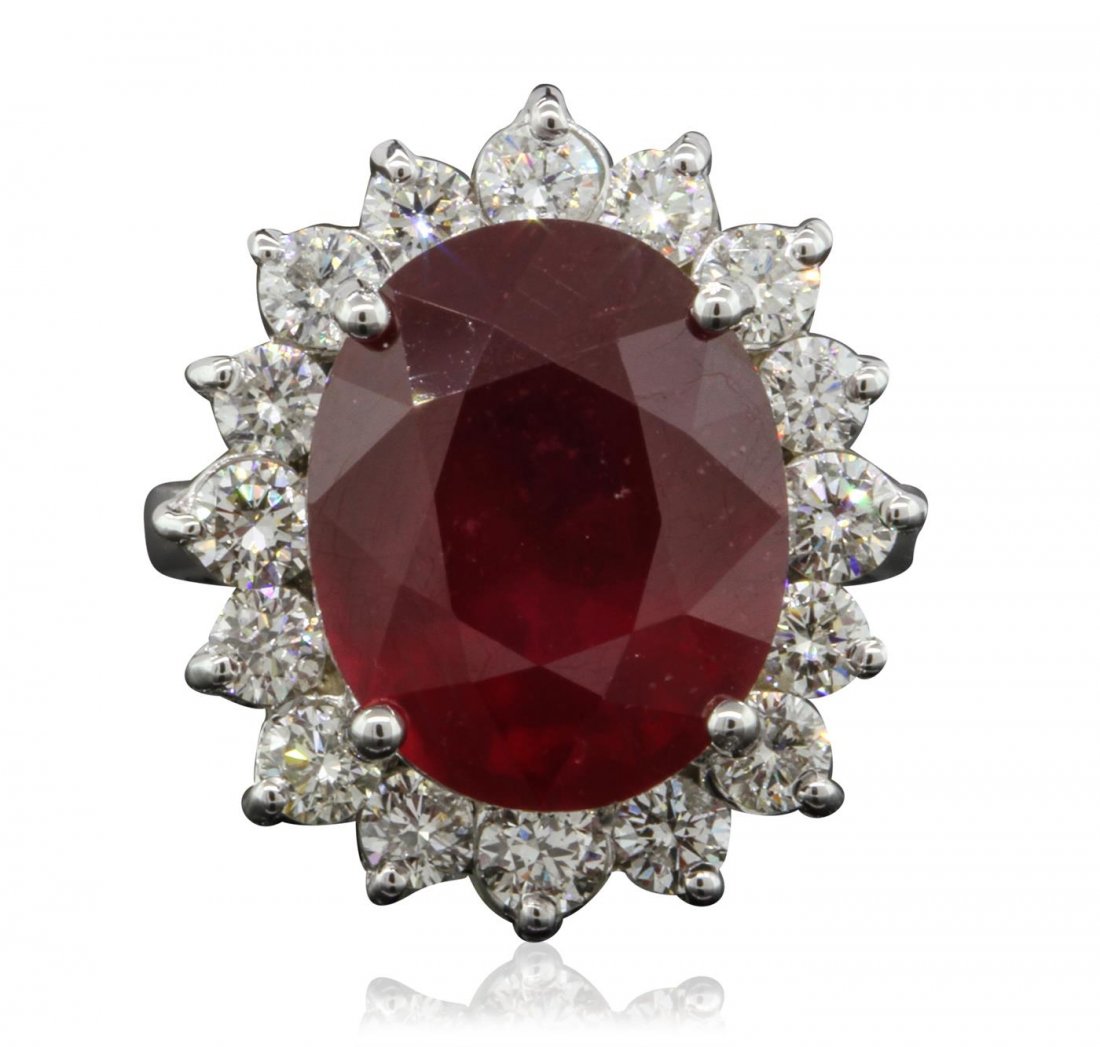 SoldA 14kt. White Gold, Ruby and Diamond Ring,A 14kt. White Gold, Ruby and Diamond Ring, Set with sixteen diamond melee weighing approximately 2-4pts. each and a ruby weighing approximately 1ct. Ring size: 6. Total approx. weight: 4.2 dwt.See Sold Price