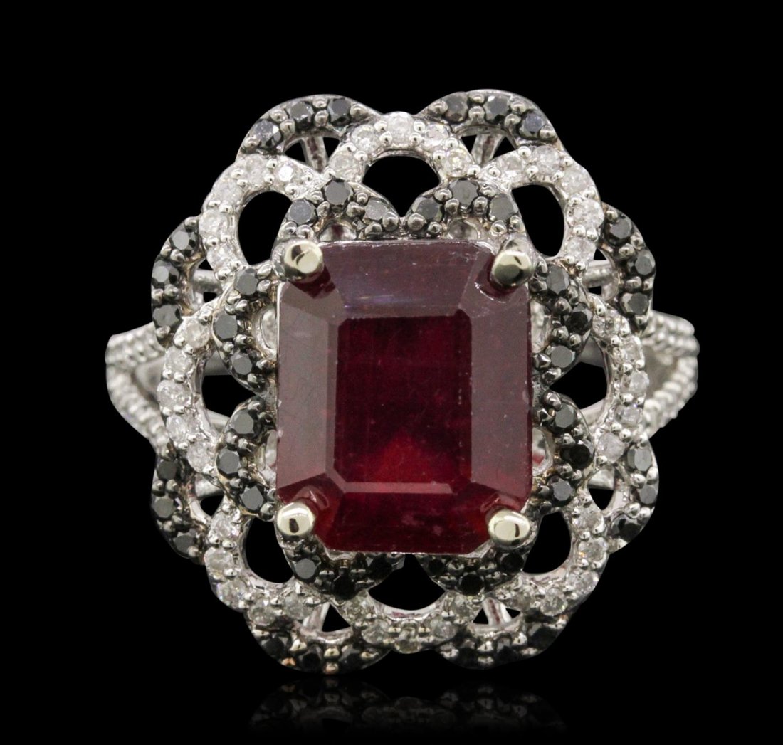 SoldA 14kt. White Gold, Ruby and Diamond Ring,A 14kt. White Gold, Ruby and Diamond Ring, Set with sixteen diamond melee weighing approximately 2-4pts. each and a ruby weighing approximately 1ct. Ring size: 6. Total approx. weight: 4.2 dwt.See Sold Price