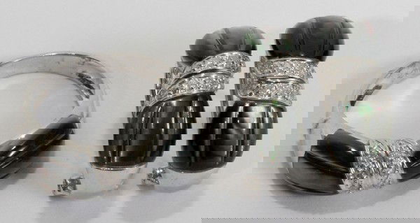 SoldJEWELRY. Men's Signed 14kt White Gold and DiamondRing. Men's signed 14kt white gold ring set with (8) round full cut diamond accents. Stamped to interior of band, "14k" alongside an unidentified maker's mark. Total approx. weight is 8.9 dwSee Sold Price