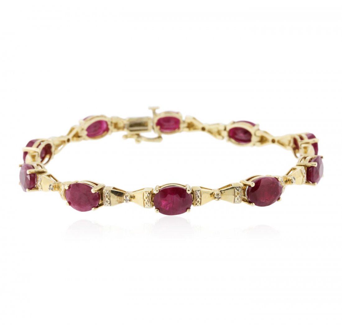 Sold14K YELLOW GOLD RUBY AND DIAMONDS BRACELET14KT YELLOW GOLD RUBY AND DIAMONDS BRACELET 7"14KT GOLD WT. APPROX. 7.13 GRAMDIAMOND WT. APPROX. 0.63 CARATRUBY WT. APPROX. 10.27 CARATSee Sold Price