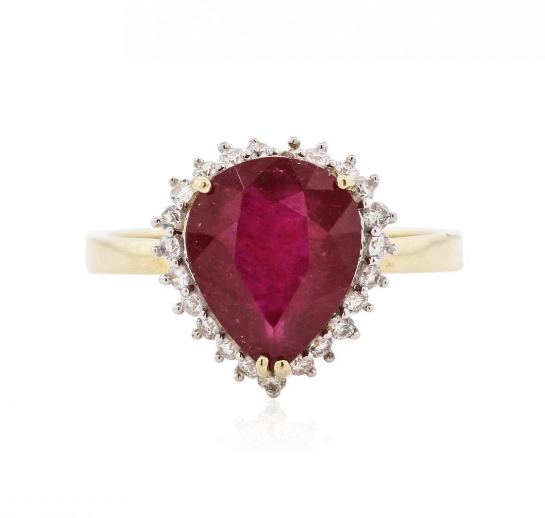 Sold14KT Yellow Gold Ruby & Diamond RingCrafted in 14KT yellow gold, this ring contains one pear shaped ruby prong set in the center, surrounded by round brilliant cut prong set diamonds. SpecificationsJewelry Information Category:See Sold Price