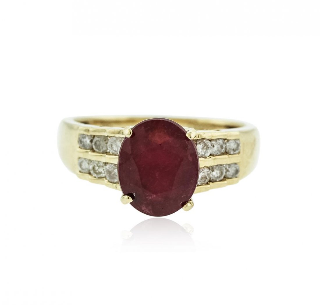 Sold14kt Gold and Gemstone Ring14kt Gold and Gemstone Ring Stamped and tested 14kt yellow gold, 2.5 dwt., size 7.5 with slightly tapered shank, 0.60 ctw oval cut ruby center stone, 20 diamond rounds approx. 0.32 cttw.See Sold Price