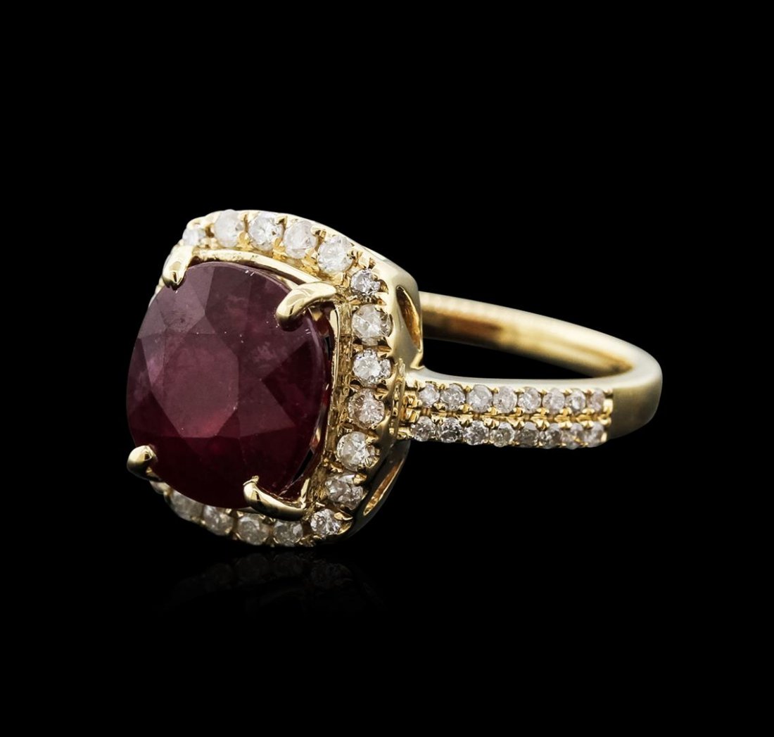 Sold14Kt Yellow Gold Ruby Diamond Ring.14Kt Ladies Yellow Gold Diamond Ring. Ring has One Ruby in the center & 20 Diamonds Round. Total Diamonds 0.36 cttw.Ruby Weight: 0.90ct. Ring size: 5.75. Total weight: 4.32 Grams.AZP1V7See Sold Price