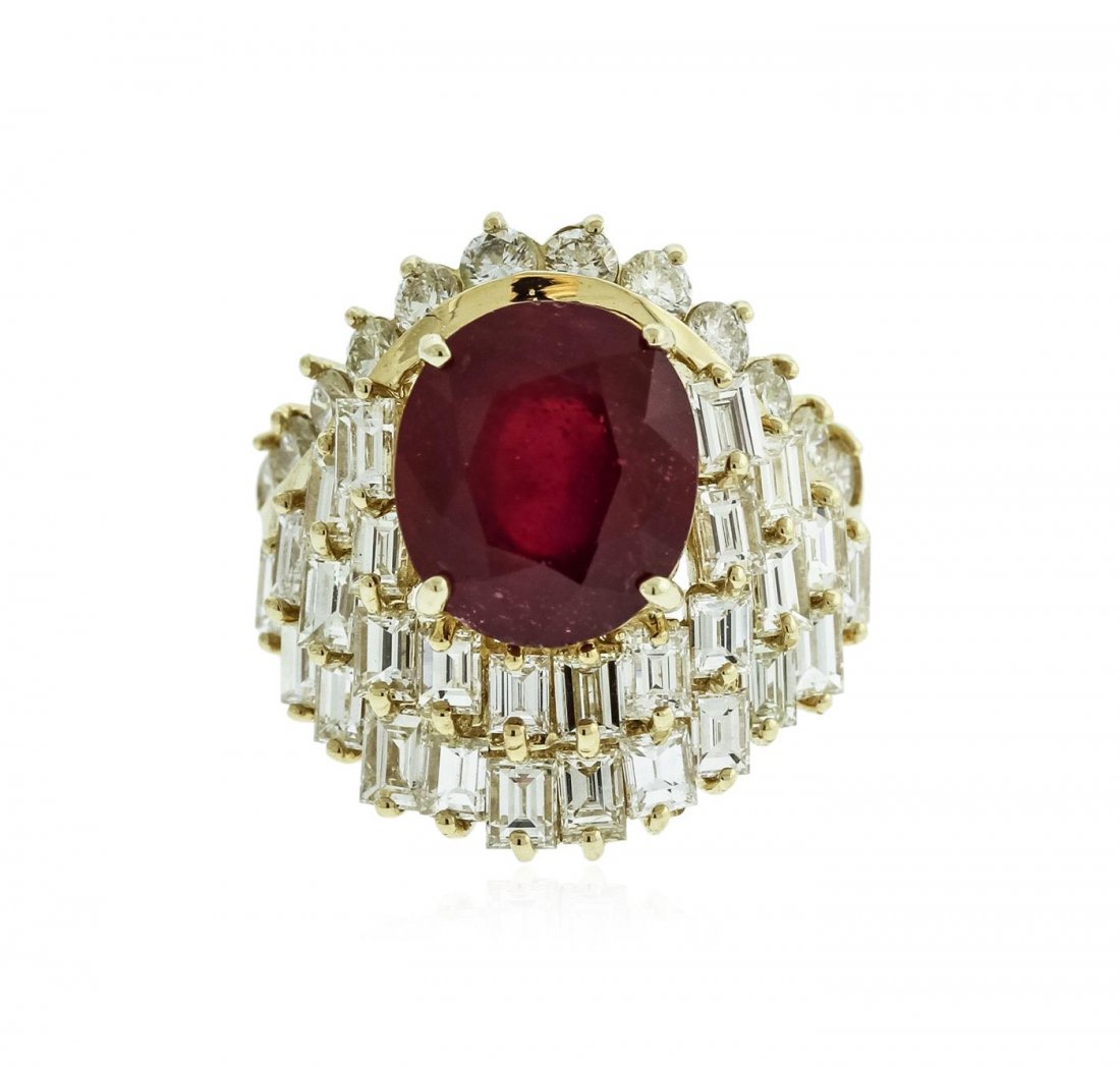 SoldESTATE 14KT GOLD, RUBY & DIAMOND COCKTAIL RINGEstate 14kt yellow gold cocktail ring, three tiers of: (39) baguette diamonds, approx 1.82cttw; and (35) round brilliant cut diamonds, approx .76 cttw; all with an average clarity: SI2-I, color: J-k;See Sold Price