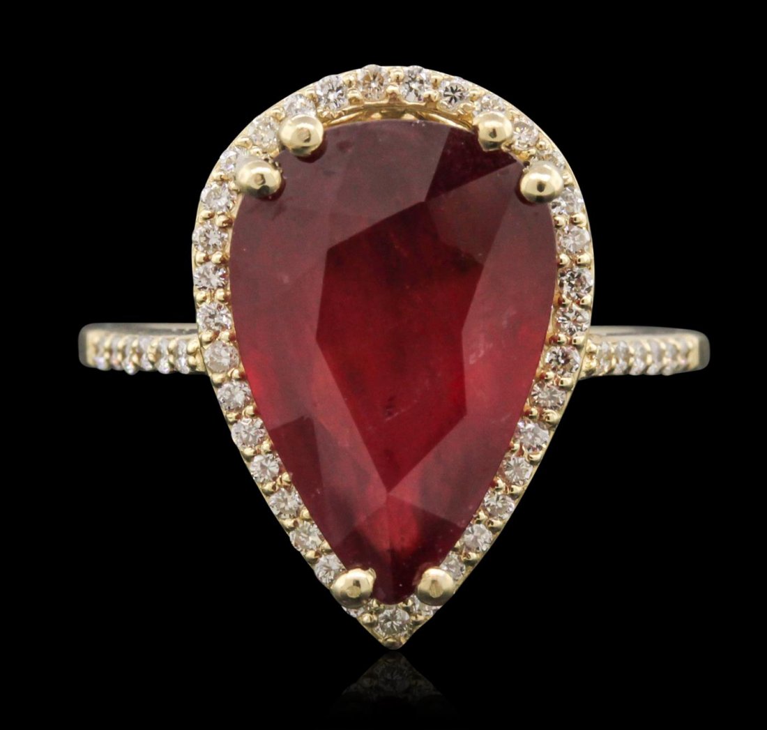 Sold14KT Yellow Gold Ruby & Diamond RingCrafted in 14KT yellow gold, this ring contains one pear shaped ruby prong set in the center, surrounded by round brilliant cut prong set diamonds. SpecificationsJewelry Information Category:See Sold Price