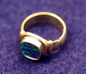 Sold14kt yellow gold opal inlay ring14kt yellow gold inlayed opal fashion band featuring a free form design and inlayed opal displaying a bluish green fire. Finger size 7.5. Weight 5.3 grams #1759See Sold Price