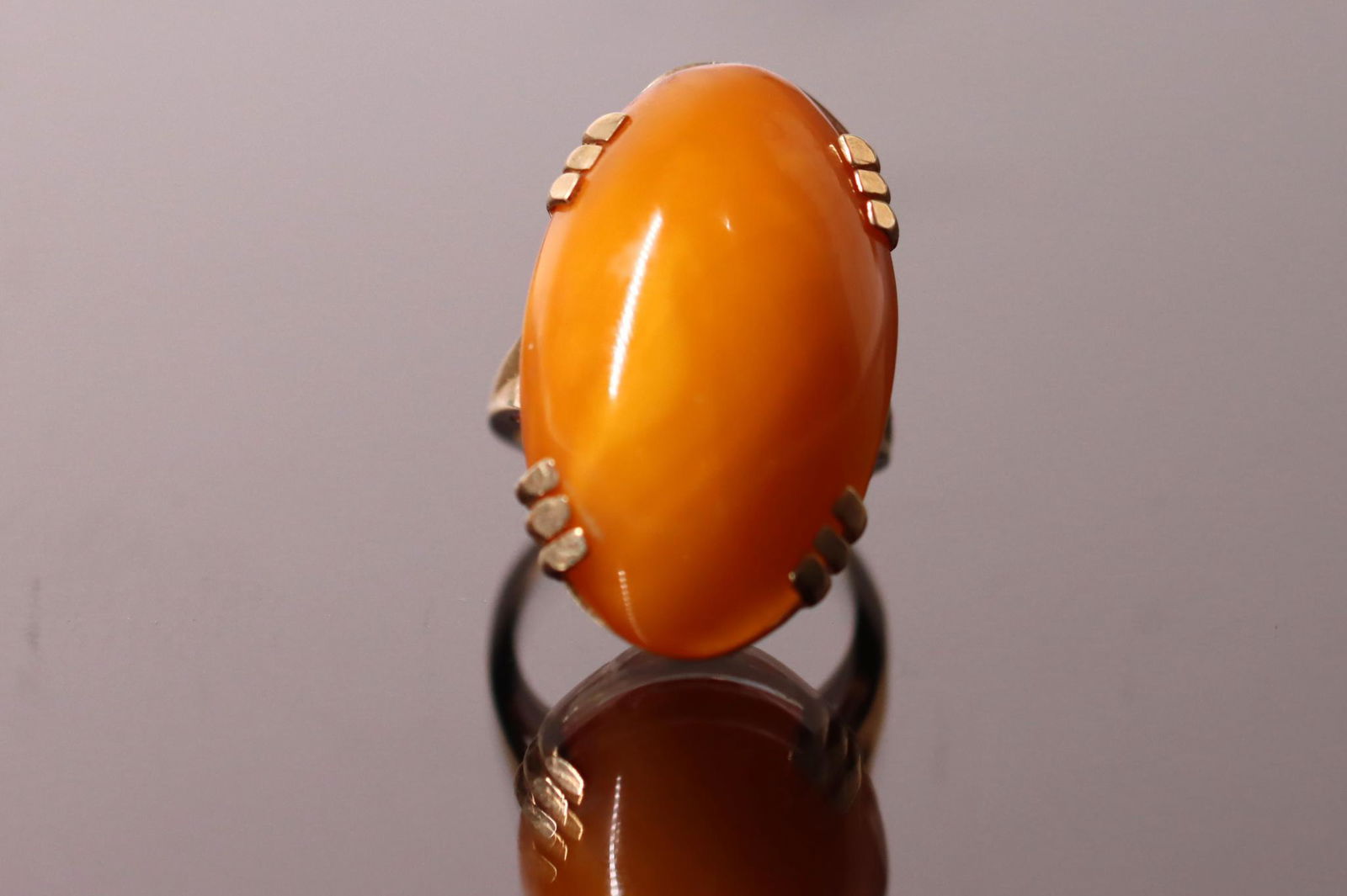 SoldEstate Russian 14k Rose Gold & Amber RingEstate 14k Rose Gold and Amber Ring – A statement ring with Russian hallmarks and 583 for 14k gold. Amber has many interesting inclusions. Approximately a size 6 and 1 inch tall. Provenance: FroSee Sold Price
