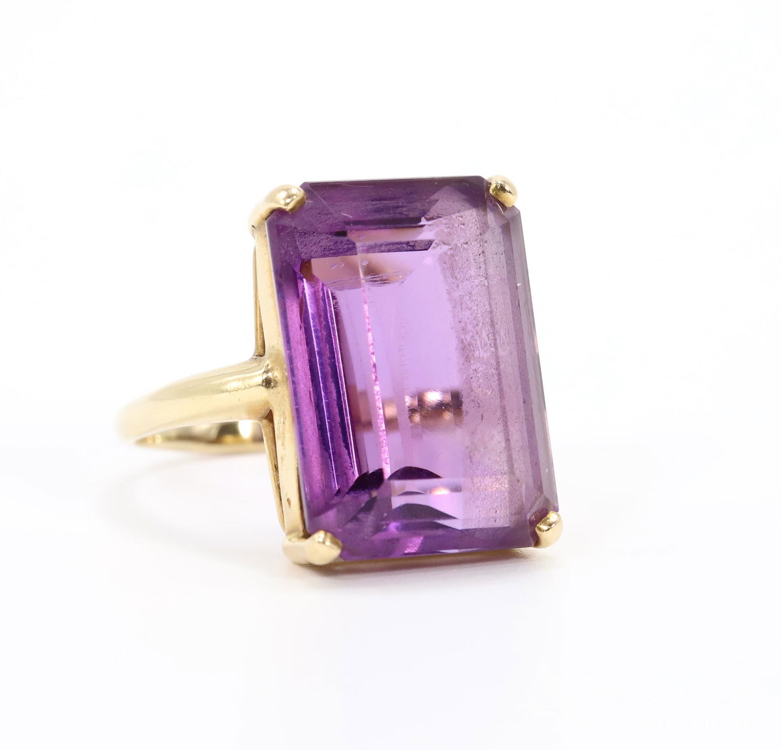 Sold14KY Gold Amethyst RingFeatures an emerald cut amethyst in a feathery frond design 4-prong setting. Inside of shank is personalized "W.H.S. 2-3-91. 19mm wide, size 10.5. 11.4gtwSee Sold Price