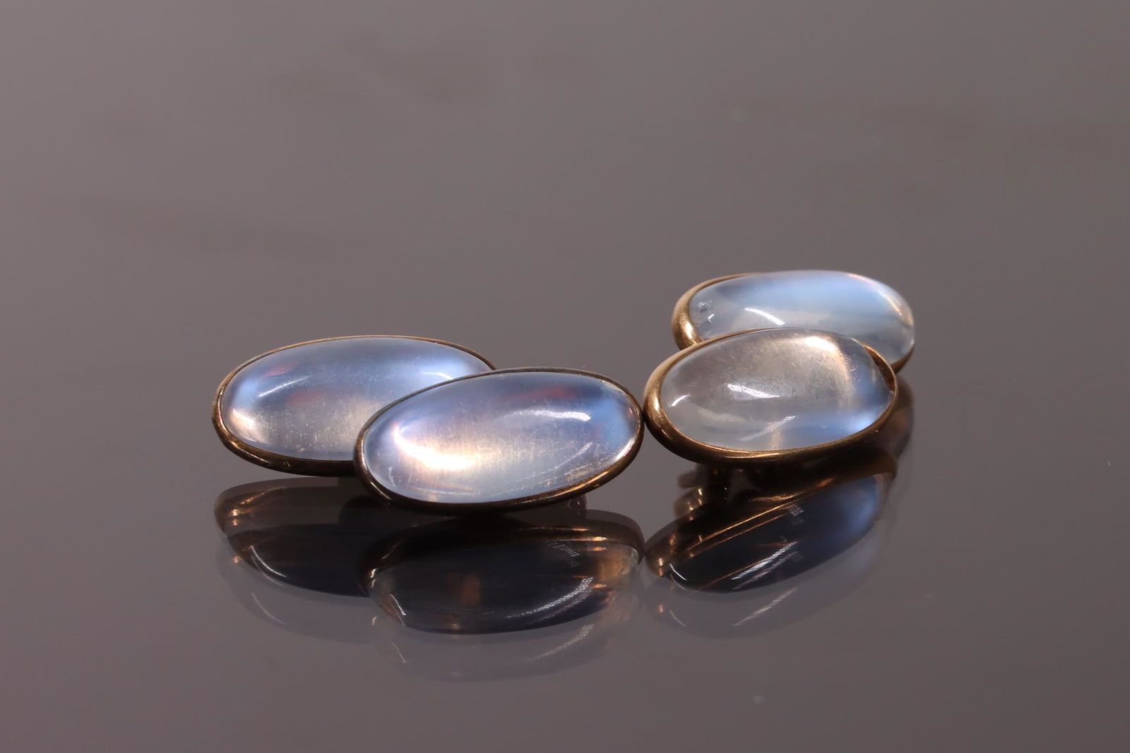 SoldA Pair of Moonstone Cufflinks.A Pair of Moonstone Cufflinks. 14 karat yellow gold mountings contain four oval cabochon moonstones Wt: 6.4 gramsSee Sold Price